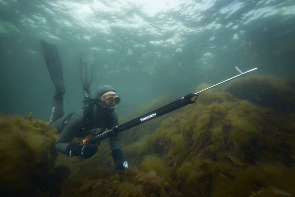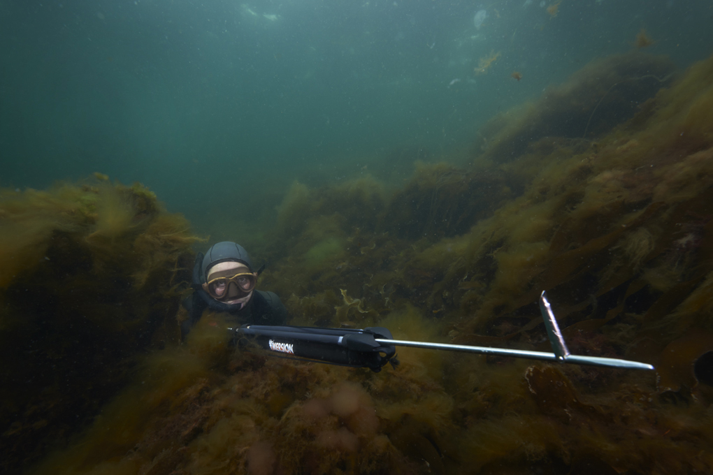 Første dyk var på ydermolen, sigten var rigtig fin. Jeg havde aftalt med Maria at jeg skulle tage nogle billeder af hende på jagt efter fisk. Det var bedst at gøre det ved molen, da hun mente at Prammen lå for dybt til at hun ville kunne gøre det der. Det blev til en række billeder af poserende uv jæger med et skarpt ladt våben.