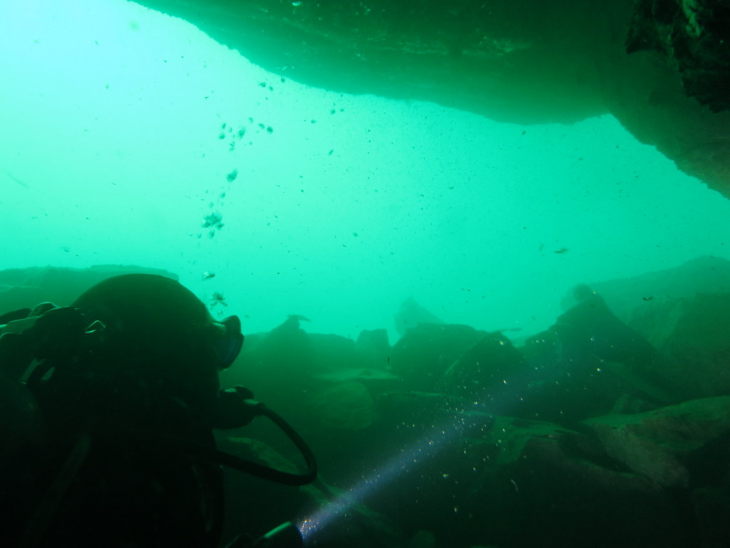 Vraget ligger neden for en lodret væg på en stejl skrænt så deco og sikkerhed stop blev taget langs vægen og på et fladt område oven for vægen.