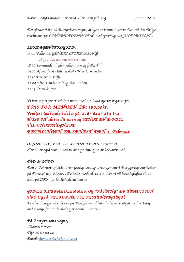 Det glæder Mig, på Bestyrelsens vegne, at igen at kunne invitere Dem til den Årlige traditionsrige GENERALFORSAMLING med efterfølgende JULEFROKOST .