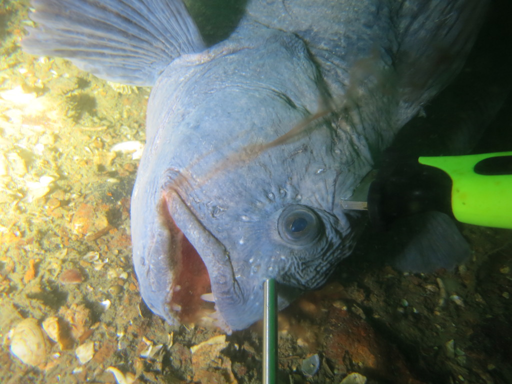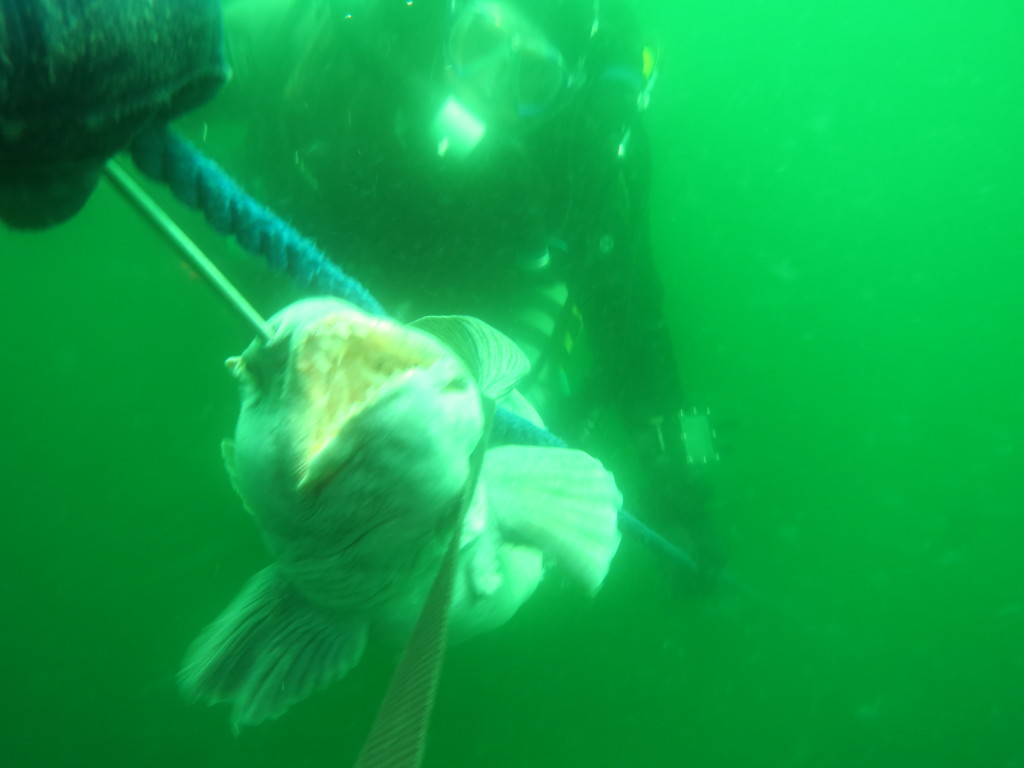 Vi fandt det huld havkatten gemte sig i og sandelig om den ikke stadig var hjemme. Thomas skulle ikke nyde noget og forsvandt hurtigt der ud hvor man kun lige kunne se ham i den ellers ganske fornuftige sigt. Emil fik placeret harpunspydet i panden på katten men det fik den nu ikke til at sove stille ind!!! Sigten forsvandt hurtigt da katten begyndte at fare rundt inde i sin hule. Vi skulle have den ud men den kunne ikke komme gennem det huld vi havde skudt den igennem… et forsøg på at få ved den ind gennem huldet blev hurtigt opgivet da katten fik ved Emils hanske! Det var ikke andet for end at grave huldet større hvilket tog lang tid! Men til sidst lykkes det.