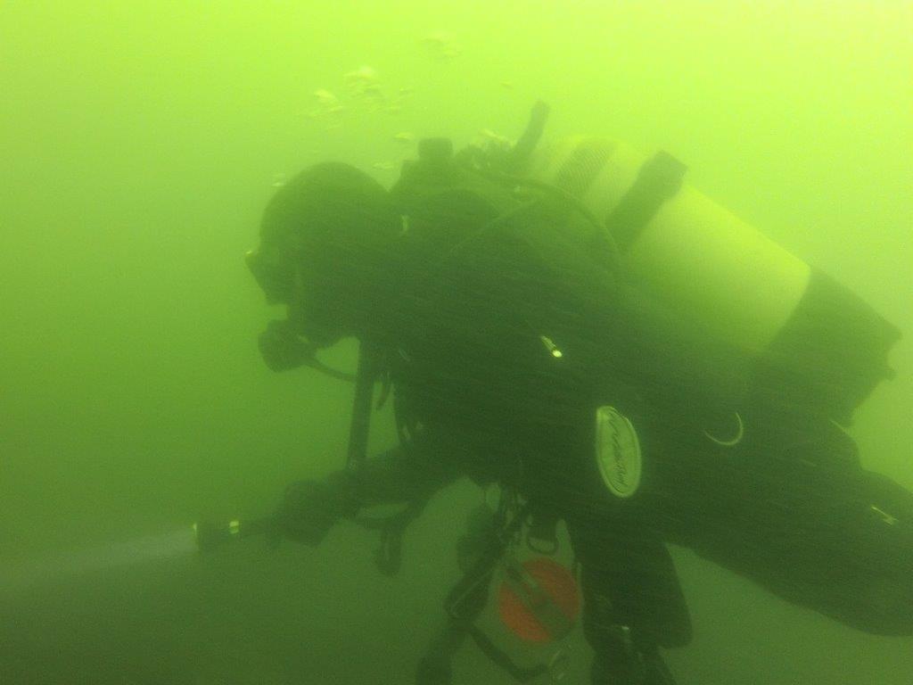 Andet dyk tog kun Jørgen, Morten og Stig og det blev af kortere varighed, strømmen var tiltaget og den middelmådige sigt gjorde det vanskeligt at holde sammen, Morten gik op da han mistede kontakten og måtte kæmpe lidt mod strømmen i overfladen, men vi mødtes alle ved broen igen.