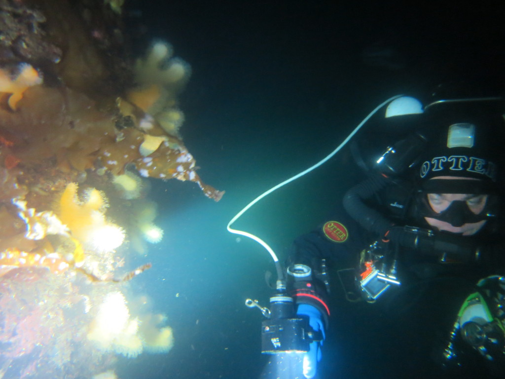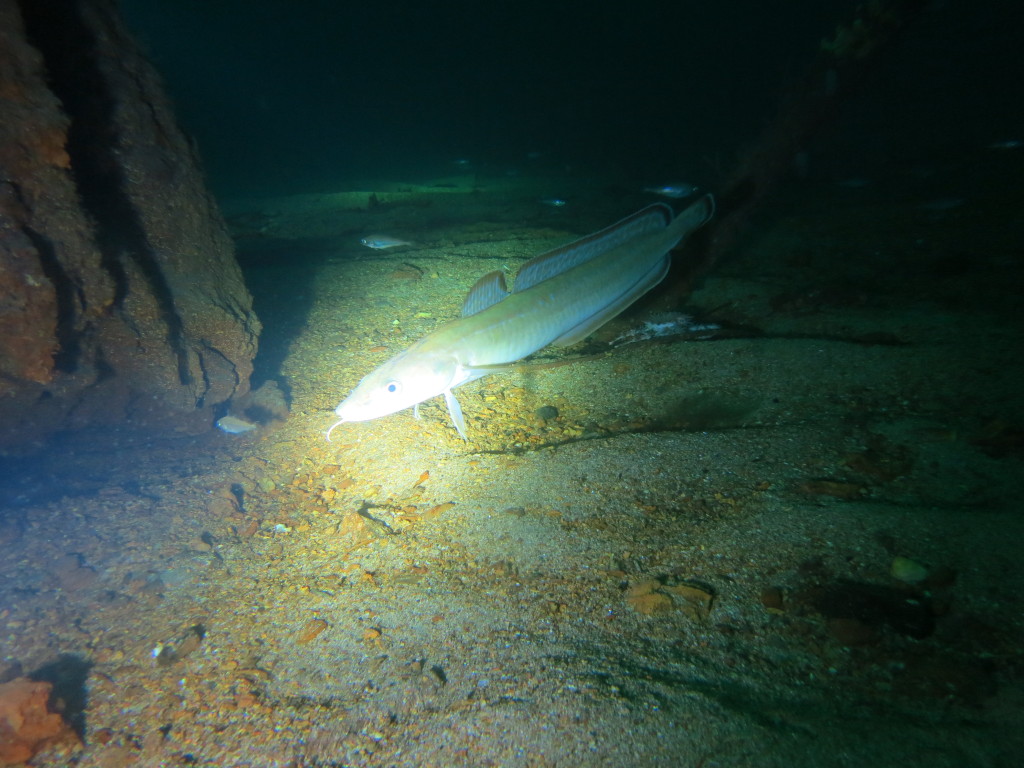 Der skulle dykkes natdyk og vi blev enige om at sejle ind på kutteren. Her kom Palle og Pernille først i efterfuldt af Kasper og Sebastian hvor efter Jørgen og jeg kunne nyde det stille vejr og lyset fra lygterne i vandet under os. Kasper fik set en blæksprutte og Pernille fik nogle fine fladfisk.
