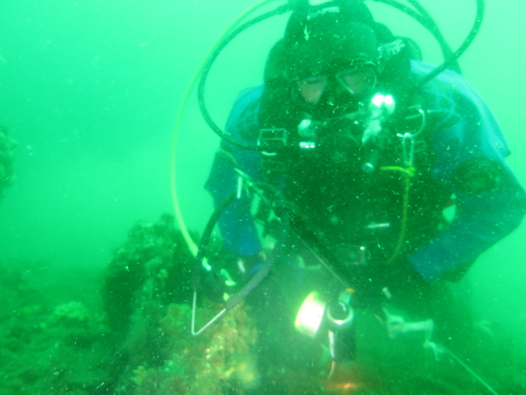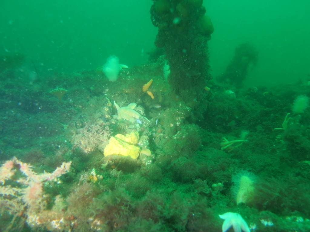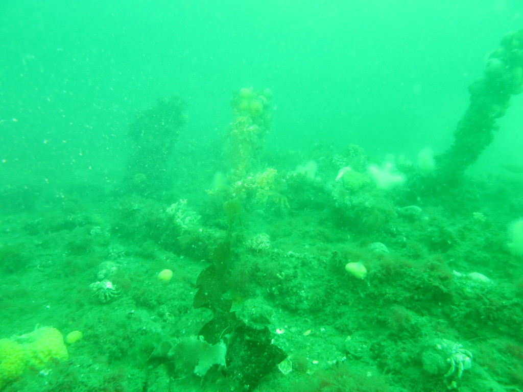 Første dyk var på M/S Olympia – vraget af en skruedamper der gik ned i 1893. Det ligger på ca 15 meter vand ikke langt fra sejlrenden. Vraget kan ikke ses på ekkolodet, men vores position er så præcis at vi satte ankeret på vraget. Der ligger en del plader. Arne fik indviet sin harpun med Emil som fiskeguide.