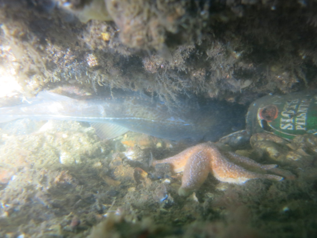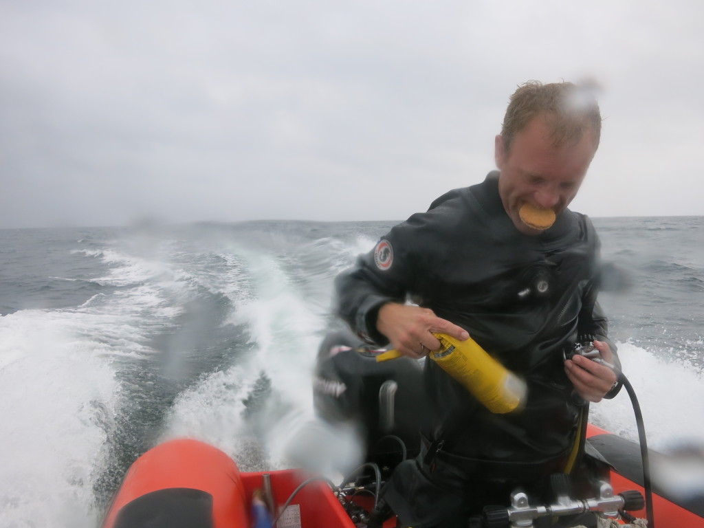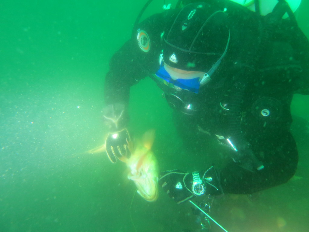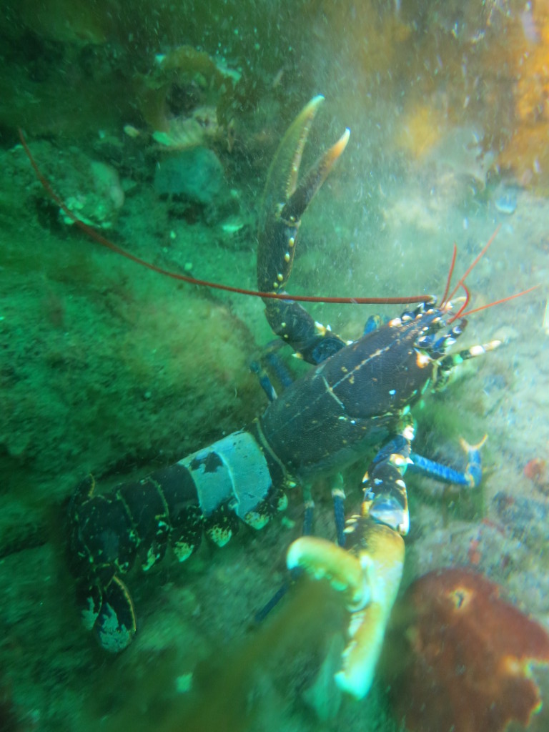 Næste dyk var på hummerrevet. Et flot stenrev. Arne og René fik listet bagom en hummer, der røg i nettet, men den næste ville bare ikke ud af hulen. Efter mange forsøg blev der opgivet. I stedet satte vi spolelinen på og steg op til båden hvorefter Emil og René dykkede ned langs spolelinen igen. Emil var resolut – stak hånden helt ind i hummerhulen – hvorefter den bed sig fast i handsken, så den kunne trækkes med ud…. Vi så flere hummere, som vi lod gå.