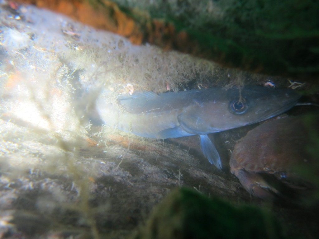 Vi forsatte om på kølsiden forbi skrugen og videre frem i vraget igen. På kølsiden er der efter hånden også massere af hulder men de fleste stadig for små til at man kan komme ind – DESVÆRRE! Men vi fandet et sted. Det var også her Sebastian så en havkat uden at fortælle mig det… Tilbage i båden nægtet han dog at der var en havkat men kaldte det i stedet for en blåfisk. Den var nemlig lidt blå uden at være rigtig blå.