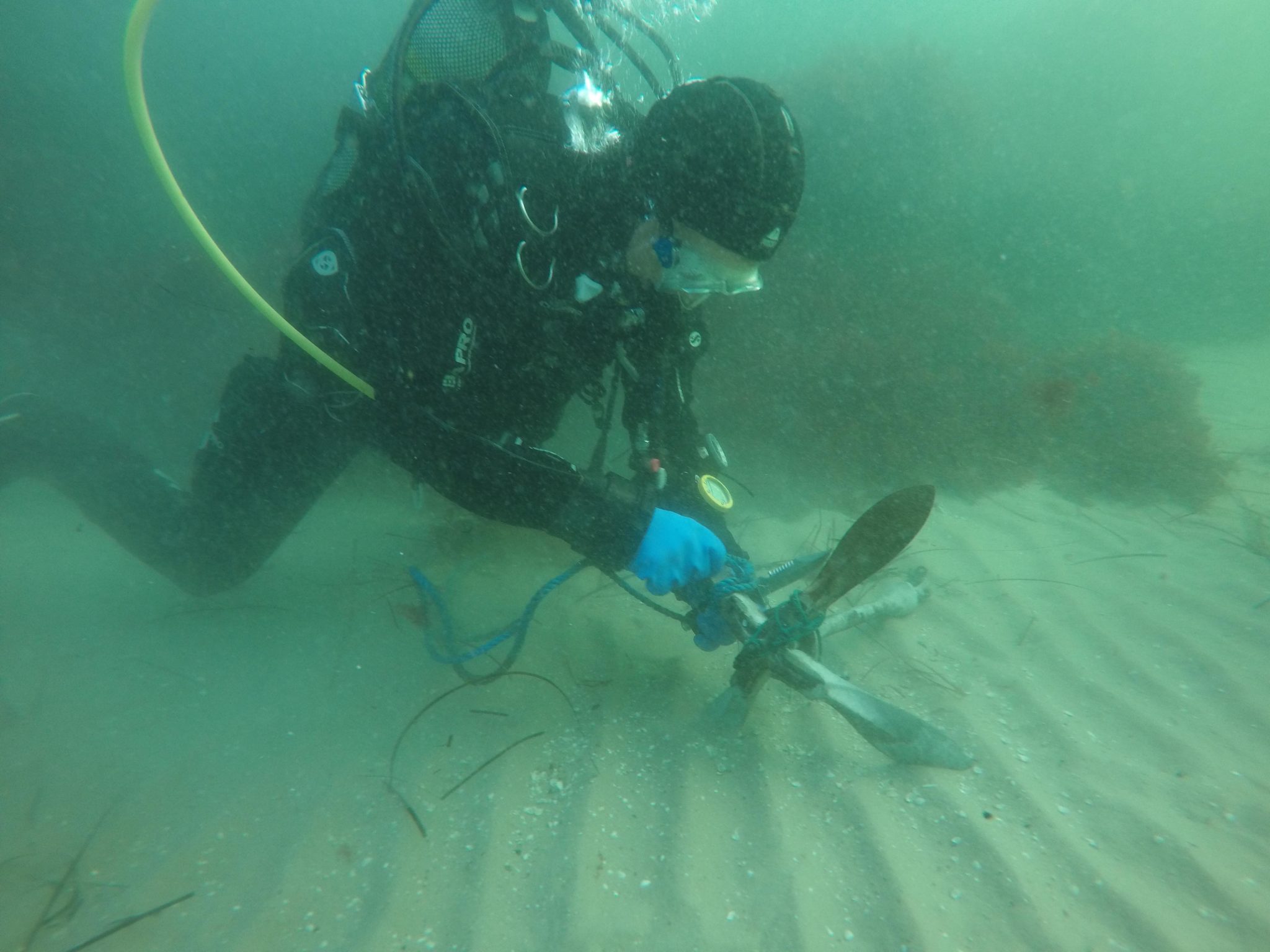 Planen var egentlig et båddyk i det gode vejr. Men da vi ikke kunne samle mandskab nok, tog Gorm, Robin og jeg til Møllemolen ved Ebeltoft Færgehavn, hvor ingen af os havde været før. Sigten var kanon, men det er desværre ikke meget dybde man får derude. Vi havde lidt af hvert med op, der blev fundet et armbånd af perler, to anker, en slethvar og en skrubbe.