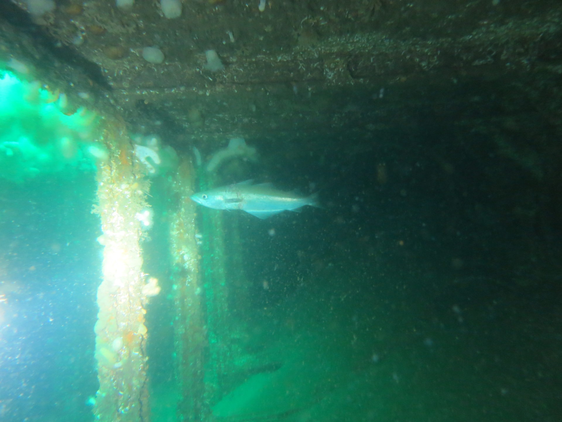 At beskrive resten af dykket bliver svært – Man skulle nok bare selv have været der – Men der er en grund til at Tukan har flere kælenavne: Akvariet og sejvraget. For vi lå konstant i en stime af lyssej af en størrelse hvor man næsten blev bange for dem. Og kigget man ind i et huld ja så var der næsten garanti for at der stod en torsk (eller mange!) og ikke sådan nogle normale nej som Sebastian mente man kunne forveksle med sin makker grundet størrelsen. Og til det vil jeg sige at for uden størrelsen så havde de en anden ting til fældes med min makker (Sebastian) de gør alt for at svømme ind i det nærmeste huld når man nærmer sig.