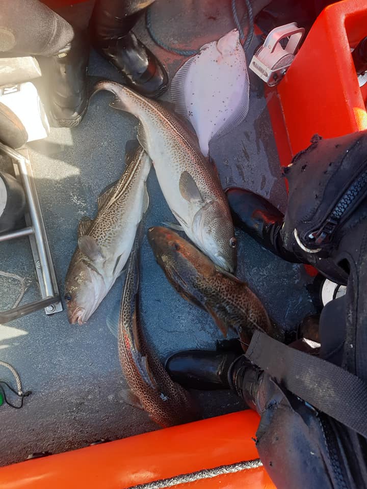 Vores dyk var noget nært perfekt. En tur rundt på hele vraget. Massere af store torsk og mange af dem var nærmest håndtamme. Det blev til hele 4 torsk taget med hånd hvor enter der ikke kunne være flere i mit net og de 3 af dem var så lange at deres haler stak ud af nettet. Et par fine ture ind i den intakte del og befrielse af en rødspætte der sad i et af spøgelsesgarnene på vraget. Desværre var en del af de torsk der gjorde den selvskab i samme garn ikke længere i live… Efter 44 min gik det mod lavere vand og vi nået overfladen 59 min inde i dykket. Med den dybde og buntid er man lykkelig med en god nitox.