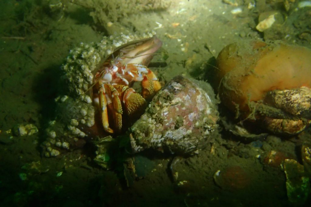 Da vi kom ned var sigtbarheden ganske god. Flere af eremitkrebsene opførte sig sjovt, da de slæbte rundt på artfæller af mindre størrelse. Ved hullet i siden af skroget kunne man kigge ind, og først for stod et køleskab, hvor alle drikkevarerne nok er faldet ud, da sammenstrødet indtraf.
