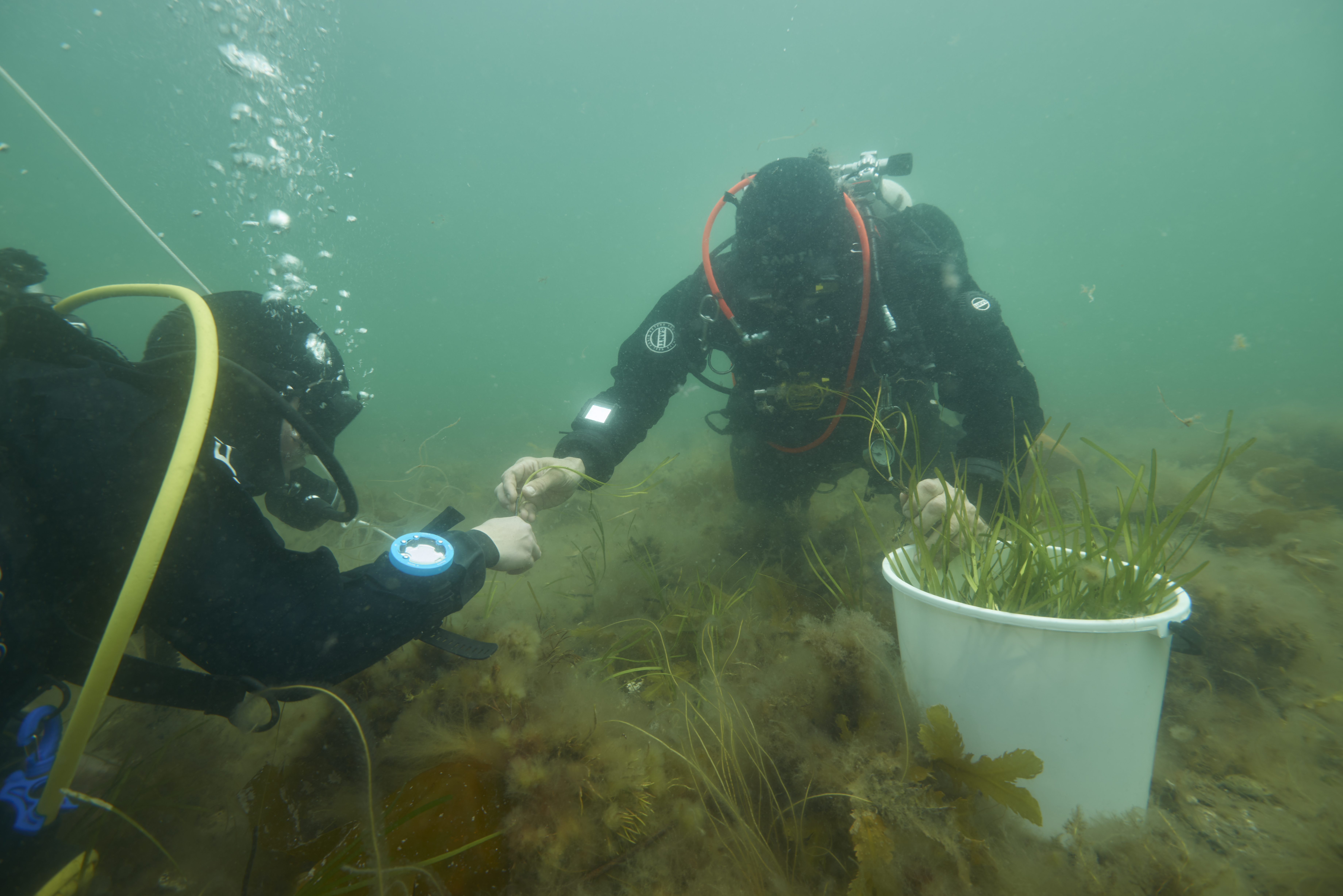 Vi var ni dykkere, der tog ud på vandet for at udplante 3.000 ålegræsskud, som frivillige havde brugt dagen på at binde i små bundter. Vores grå rib sørgede for at fragte både skud og folk frem og tilbage, mens tornadoen lå som base for dykkerne.